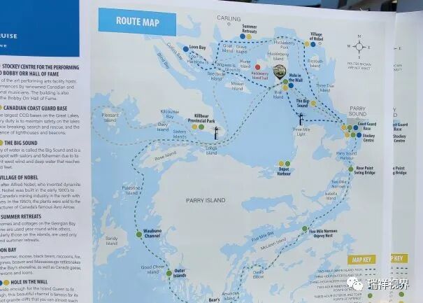 帕里湾Parry Sound,紧靠Lake Huron(休伦湖)的Georgian Bay(乔治亚湾),地理位置得天独厚。小镇于1887年正式建制,已有130多年历史。漫步恬静的古镇街头,一排排设计精巧的别墅映入眼帘。古香古色的路灯和挂在灯杆上的小镇标志图案——湖水、岛屿、松树,格外引人注目。帕里桑德不仅是休伦湖畔一座重要的湖港小镇,也是乔治亚湾唯一的游轮起航地,过一会儿我们就在这里登船巡航。