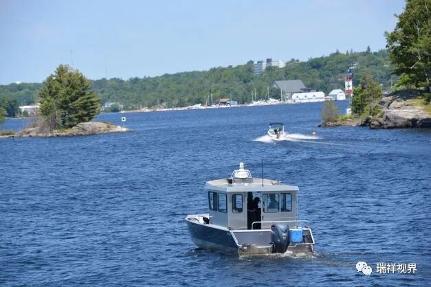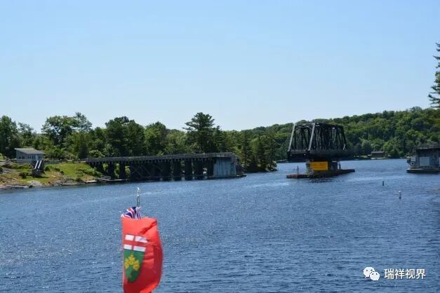 航行约20分钟,我们来到了著名的沃沙卡森转向桥(Wasauksing Swing Bridge)。它原是建于1887年的铁路桥,1912年改建为机械转向式湖陆两用桥。大桥横跨乔治亚湾“南向水道”,连接陆地上的“玫瑰角”(the Rose Point)和群岛中最大的岛屿“帕里岛”。桥面为单车道,靠两端的红绿灯控制车辆通行,当游轮通过时桥梁中部自动转为竖向开放水道。这座百年前的湖陆交通枢纽是三万岛巡航中一个特色景观。