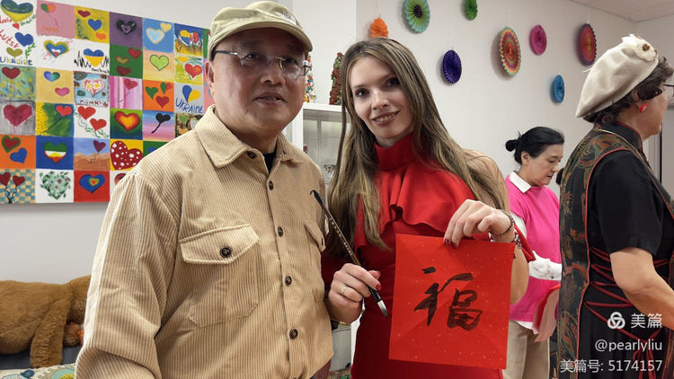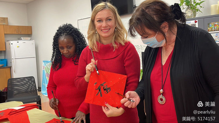 联欢会结束后,进入教移民中心工作人员写春联的环节。看看国际友人是怎样用毛笔写中国字的。